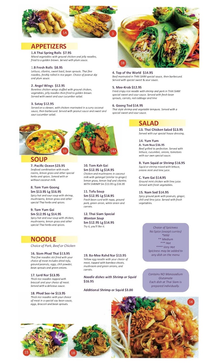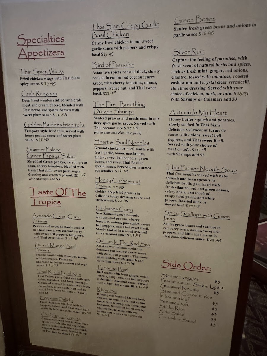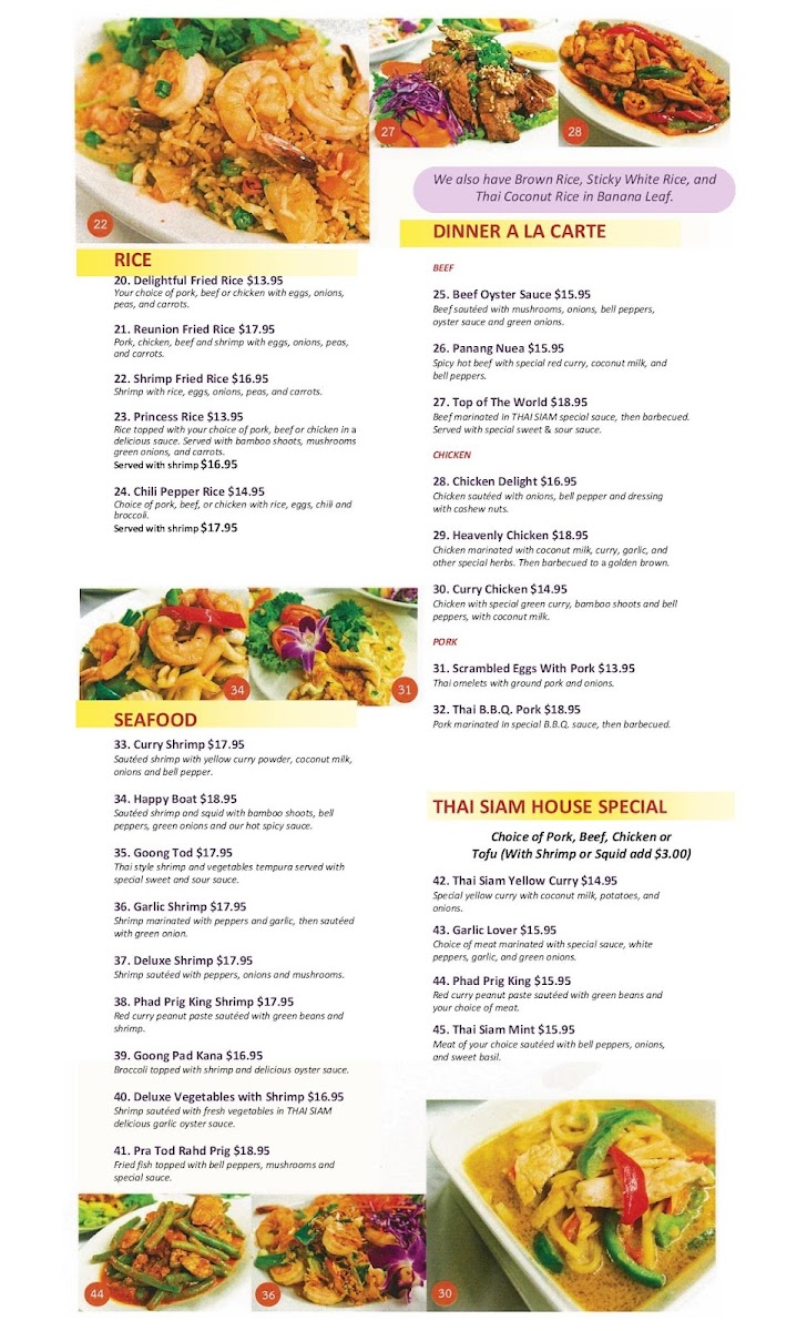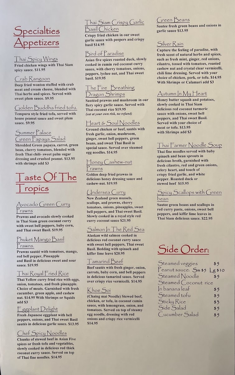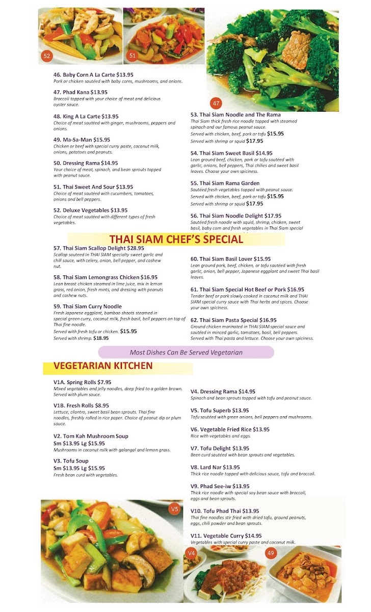 The menu at Thai Siam is a testament to the culinary traditions of Thailand, featuring a rich array of dishes that cater to every palate. Begin your journey with their Crispy Garlic Chicken—perfectly fried to achieve that crunch while allowing the bold flavors to shine through. For pasta lovers, the classic Phad Thai promises to excite with its balance of sweet and savory, topped with fresh peanuts and lime. Another must-try is the Heavenly Chicken, marinated in aromatic coconut milk and spices, barbecued until golden brown, delivering a tender and sumptuous experience with every bite.